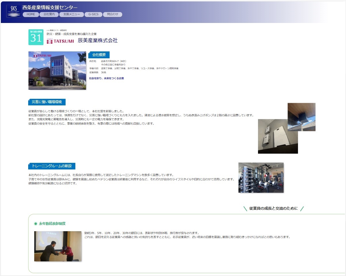 NEWS&TOPICS 2025 11/25 「いい職場づくり事例集」に掲載されました! RECRUITINFORMATION このたび、弊社の取り組みを(株)西条産業情報支援センター(SICS)様に取材頂き、同社のホームページ内「いい職場づくり取り組み事例集」にて掲載されました。今回の記事では、従業員が安心して働ける環境づくりの一環として弊社が取り組んでいる下記の事例について取り上げて頂きました。・耐震等級3の災害に強い構造・停電に備えた太陽光発電・蓄電池・浸水を想定した設備の配置・自社トレーニングルーム・永年勤続表彰制度・懇親会費助成制度・資格取得支援制度・オンライン朝礼・終礼・社内報による情報共有・人間ドック受診の会社負担特に、トレーニングルームについては、従業員がスキマ時間に運動できる環境を整えることで、健康増進はもちろん、気分転換や社内コミュニケーションの活性化にもつなげています。弊社は「従業員の命と健康を守ること」を大切な経営方針の一つとして、働く環境や制度の整備を進めてまいりました。今回、SICS様にその点へご関心をお寄せいただき、取り組み事例としてご紹介いただけたことを大変光栄に存じます。SICS様、このたびはご取材・ご掲載を賜り、誠にありがとうございました。今後も、従業員がいきいきと安心して働ける職場づくりを推進し、地域・社会に貢献できる企業を目指してまいります。■掲載ページ(SICS様HP)いい職場づくり取り組み事例集 | 辰美産業(外部サイト) SICS様、西条市様、この度は取材して頂き、誠にありがとうございました! 一覧に戻る